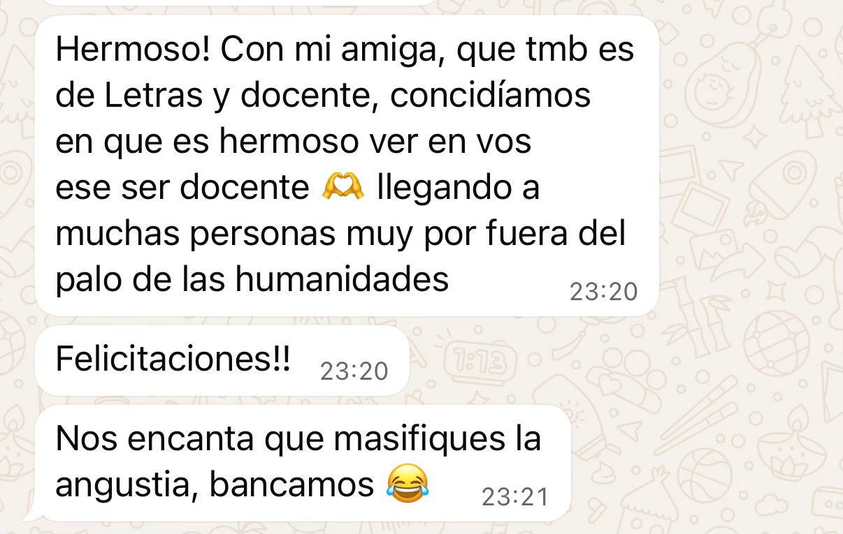 Lo que me da timidez no tiene que ver con ocupar un rol. Eso me sale muy bien. El problema aparece, justamente, cuando no sé qué rol ocupar. Cuando estoy “en modo docente” o “en modo filósofa” sé quién tengo que ser y cómo reaccionar. Y por eso puedo subirme a un escenario o dar una clase frente a muchas personas. Lo que no me sale es justamente lo contrario. Habitar esos espacios en los que simplemente tengo que ser yo. Ahí, muchas veces, siento que no tengo muchas cosas para decir y me agarra una timidez bárbara.